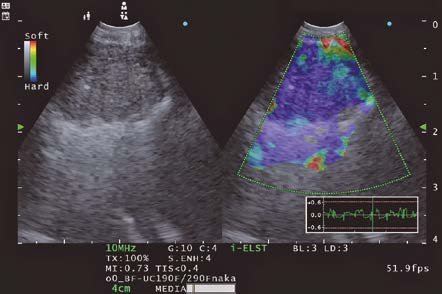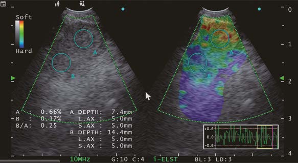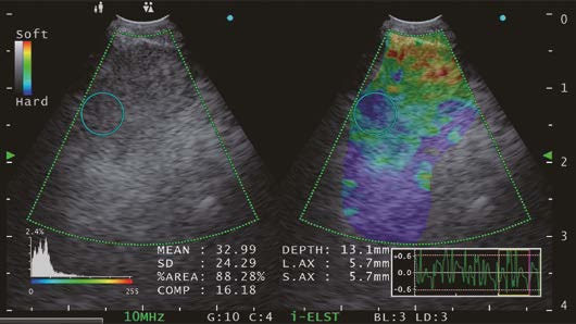 The Endoscopic ultrasound procedure typically utilizes a variety of observation modes depending on procedure type. In addition to the basic observation mode, the EU-ME3 features an elastography function which visualizes the amount of strain in the tissue (tissue stiffness) during compression and retraction, making it possible to obtain more information about tissue properties.