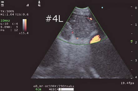 In this case, blood flow was observed in the upper right of the lymph node where the needle would pass through, so it was necessary to avoid this area when puncturing the lymph node.